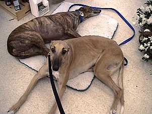 Hi, my name is Nodak Glen. I don't really know my name but that's what people keep calling me. I use to work all the time at the track. But now I live in a big crate with people and another Greyhound. To get in the big crate I have to climb a steep hill with steps. That was hard at first, but I picked it up quick. I get a nice soft place to sleep. This is where I spend most of my day now. After spending a couple of days here, I had to go to another big crate with a lot of other dogs and other little furry things. Different people kept poking me and took a part of my body off, but otherwise they were nice. I don't seem to like the girls as much as I used to. That's cool because now I get to sleep more. : 8 ) -George (Interpreter) |